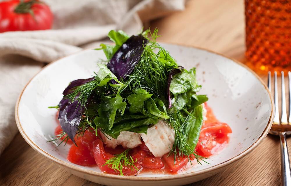 2) Томаты нарежьте кружочками и выложите на тарелку, полейте соусом.