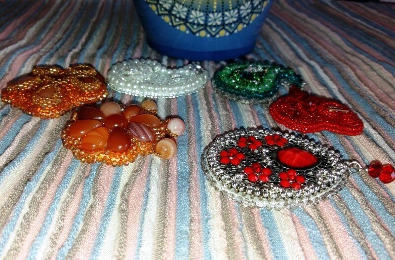 Добрый день! Сегодня покажу фотографии некоторых брошек, которые сама мастерила. Было интерено попробовать повышивать бисером и бусинками. Для создания брошек использовала материалы новые (фетр, бусины, бисер, разъёмные колечки, застёжки) и б/у (кожзам от сумки, элементы от бижутерии). Также нужна бисерная игла, мононить или тонкая леска, клей Момент Кристалл прозрачный, ножницы. Для зелёной брошки пригодилась моя серёжка-гвоздик с зелёным стразом и из дочкиной бижутерии веточка под серебро. Пришила их к фетру бисером. Затем всё обшила японским зелёным бисером, чешскими стеклянными бусинами и немножко китайских металлических бусинок. В белой брошке: пришивной стразик, акриловые бусины под жемчуг и прозрачные огранённые, бисер японский стеклянный и китайский металлический. Брошь-сердце. Использовала металлическое сердечко из дочкиной бижутерии. Японский бисер и несколько чешских бусин. Брошка-звёздочка. Здесь кабошоны и японский бисер. Брошка с тремя натуральными агатовыми бусинами. Зде