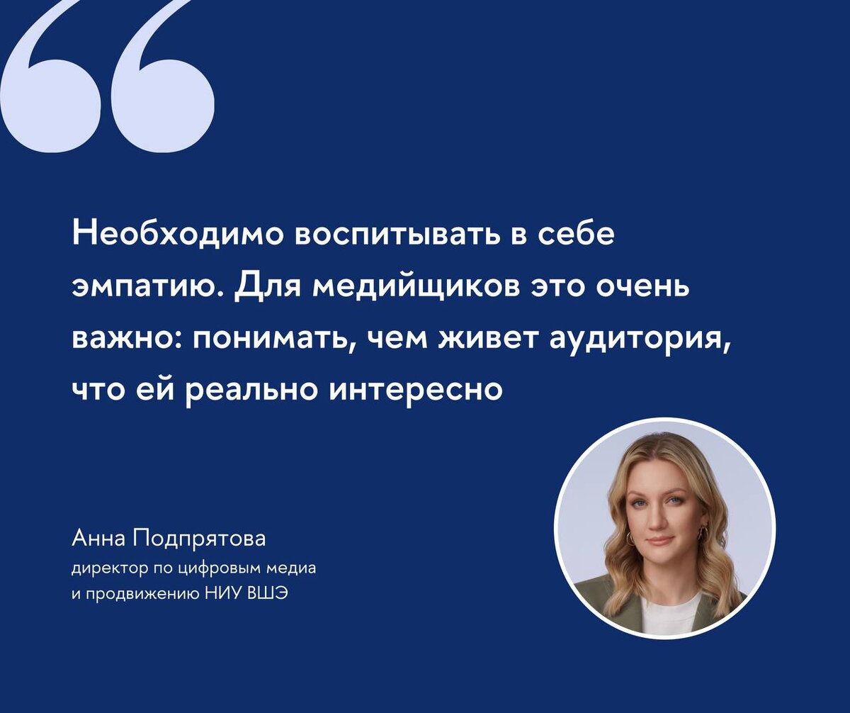 Этика цифровой эпохи и современное медиапространство требуют переосмысления традиционных ценностей и смыслов, а также подходов к регулированию. Необходимы качественное образование, критическое мышление, медиаграмотность — то, чему учит сегодня Вышка, полагает директор по цифровым медиа и продвижению НИУ ВШЭ Анна Подпрятова. О цифровой этике и традиционных ценностях в мировой индустрии развлечений и СМИ, а также о цифровой психологии в контексте новой медиаэтичности говорили эксперты на специальной сессии Петербургского международного экономического форума. Собрали основные тезины Анны Подпрятовой, директора по цифровым медиа и продвижению НИУ ВШЭ, с дискуссии: «Сейчас нужно вкладываться в создание качественного контента и образование, в том числе медиаобразование. Необходимо учить лучшим практикам создания контента, взращивать критическое мышление». «Качественное образование, критическое мышление, медиаграмотность — это важная история. Очень хорошо, что государство, университеты, в том