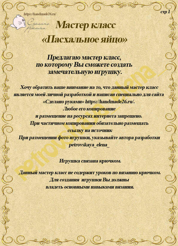 Мастер класс очень простой, осилит даже новичок. Для вязания такого яйца можно использовать остатки пряжи, главное чтобы пряжа была одинаковой толщины. Размер готового пасхального яичка зависит от толщины выбранной пряжи. Для украшения я использовала бусины. Легкого всем вязания!!! Мои мастер классы можно увидеть тут: https://handmade26.ru/catalog/vyazanie/master-klassy/ Готовые работы тут: https://handmade26.ru/