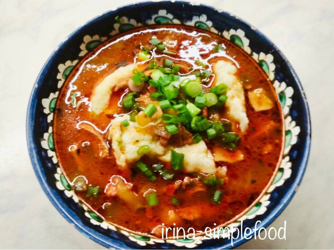 #солянка #первыеблюда #клецки Сытная, ароматная соляночка. Ингредиенты: бекона, отварной язык (не большой, почищенный), полукопчёной колбасы, солёных огурца, репчатый лук, томатной пасты, Масло растительное для жарки, Лавровый лист, Чёрный и душистый перец горошком, Соль, мясного бульона, Для клёцек:, яйцо, муки, воды, соли, Зелень петрушки Способ приготовления: Бекон, язык, колбасу нарезать тонкими полосками. В кастрюле с толстым дном обжарить на растительном масле нарезанный небольшими кубиками лук, добавить бекон, язык и колбасу, обжаривать 3-5 минут. Затем добавить томатную пасту и огурцы, влить немного бульона и обжарить 5 минут. Затем влить оставшийся бульон, посолить и поперчить по вкусу, положить лавровый лист и специи, варить на среднем огне 10 минут. Приготовить клецки: петрушку измельчить, яйцо взбить с солью и мукой, добавить петрушку, влить понемногу воду, хорошо перемешать, накрыть и оставить на 10 минут. Выкладывать тесто смоченной ложкой в кипящую подсоленную воду, когд