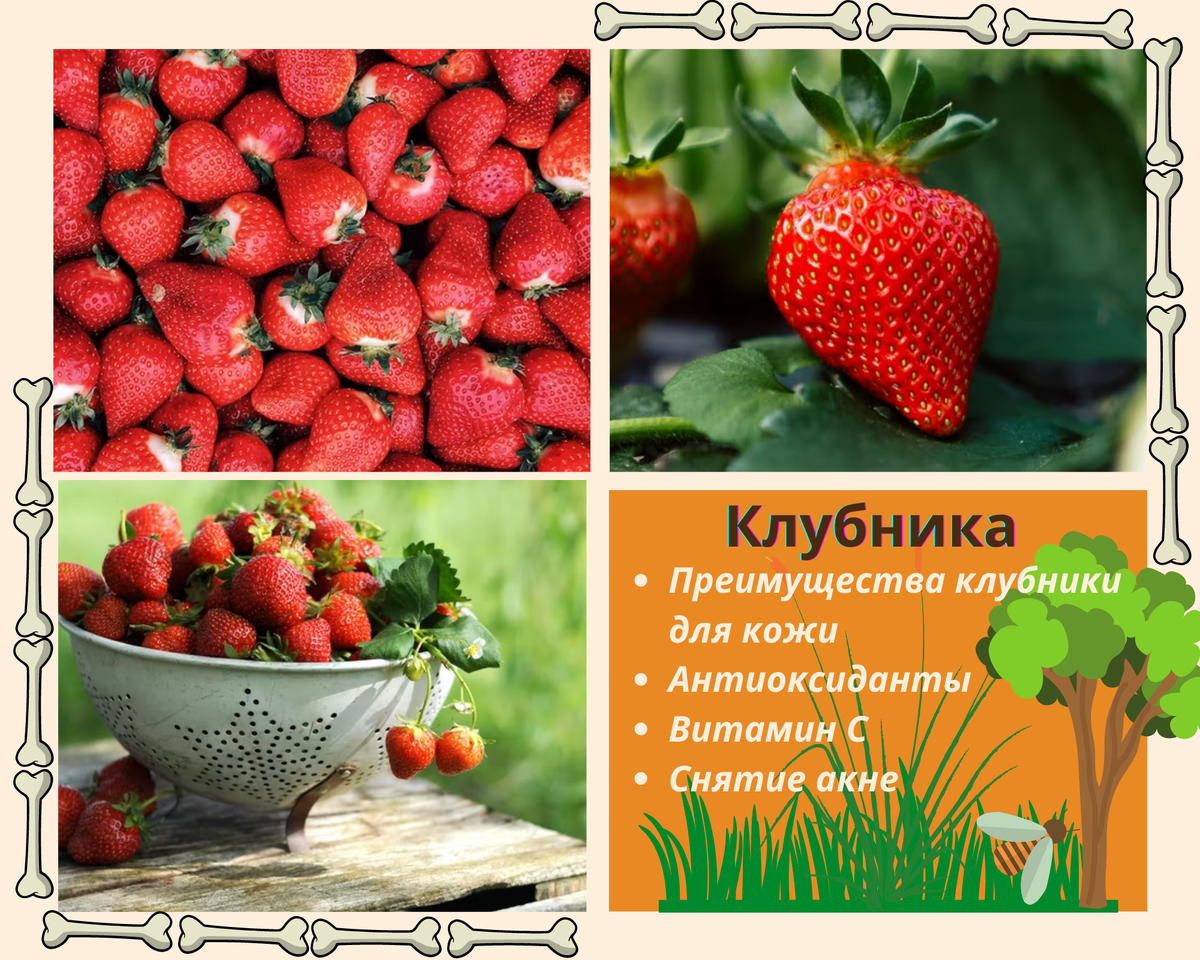 Преимущества клубники для кожи Антиоксиданты Антиоксиданты представляют собой химические соединения или вещества, которые ингибируют окисление. Они друзья тела. Они выявляют, нейтрализуют и уничтожают свободные радикалы, наносящие вред организму. Свободные радикалы ускоряют процесс старения, разрушая коллаген и снижая уровень кислорода в клетках. Когда свободные радикалы побеждают антиоксиданты, могут развиваться старческие или плохие состояния кожи, такие как морщины, предраковые или раковые поражения. Витамин С В клубнике особенно высокое содержание витамина С. Витамин С обладает омолаживающими свойствами. Уменьшить появление тонких линий, морщин и пятен. Улучшение эластичности кожи и регенерация новых клеток кожи. Салициловая кислота: Клубника содержит салициловую кислоту, натуральный и нежный эксфолиант для кожи. Устранение накопления омертвевших клеток кожи. Осветляет кожу, уменьшает темные круги под глазами, защищает от свободных радикалов. Бороться с угрями и прыщами. Исчезают