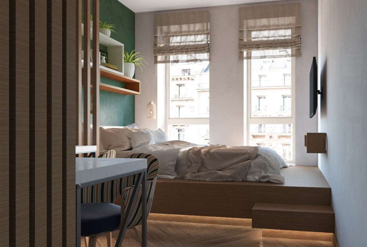 Для отделки стен в спальне выбрали два цвета: мягкий тон жасмина в обрамлении окна и глубокий оттенок зелёной хвои на акцентной стене. Кровать установили на подиуме у вертикальных парных окон. В дневное время спокойная зона освещается естественным светом. Вечером можно опустить тканевые ролл–шторы и создать приватную атмосферу с помощью свисающего светильника.