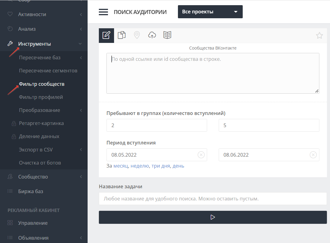 Я уже не представляю запуска рекламы без этих аудиторий, поэтому делюсь с вами. Схемы проверены не один раз. Поэтому обязательно протестируйте их, пока они работают) И так приступим, для поиска аудитории нам понадобиться парсер, я пользуюсь TargetHunter. *ДЛЯ БЕСПЛАТНОЙ АВТОРИЗАЦИИ НА 2 ДНЯ ИСПОЛЬЗУЕМ ПРОМОКОД: ДОБРОПОЖАЛОВАТЬ (СЛИТНО) Схема 1: Собираем аудиторию, которая активно интересуется похожим товаром или услугой в ВК. Отследить их не сложно. Такие люди начинают активно вступать в тематические сообщества, поэтому наша задача найти тех, кто за последний месяц вступил в 2-5 сообществ конкурентов. 3. И уже с отфильтрованной базы конкурентов собираем участников: Или 3.1 Идем в Сбор — участники: Готово! Первая горяченькая аудитория собрана! Поехали дальше… Схема 2: Собираем тех, кто писал в личку конкурентам: В ВК мы можем запустить рекламу на активных участников сообществ, с помощью вкладки: Активность в сообществах. Это сделать оченьпросто: вы вставляете ссылки на сообщества, а В