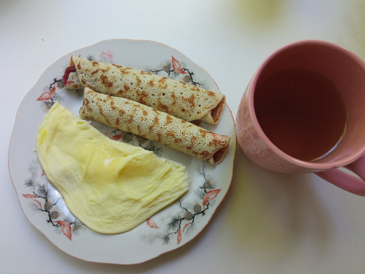 Доброго времени суток, дорогие читатели! По собственному опыту знаю, что одно из препятствий в переходе на здоровое питание-это нежелание готовить себе отдельно. Например, мама решила привести в форму свою фигуру, а муж и дочь не в восторге от овсянки на завтрак и брокколи на ужин. В итоге ребёнка нужно накормить супом, мужа - отбивной с картошкой, а себе как-то успеть приготовить куриную грудку с овощами, при этом в сутках как и раньше, всего 24 часа и совсем нет сил готовить. Эта проблема меня раньше чаще всего и останавливала, в итоге было проще приготовить что-то для всех, но это что-то часто было очень калоорийное- блюда с картошкой, выпечка и т. д. Сейчас я стараюсь найти с домашними компромисс в еде и плавно перевести всю семью на здоровое питание. Выпечку разрешаю себе в первой половине дня, до 12-00. Вот пример рациона, который был не только для меня но и для всей семьи, разве что размер порций разный) Завтрак Омлет, 2 блинчика-с вишней и мясом. Обед по времени активной г