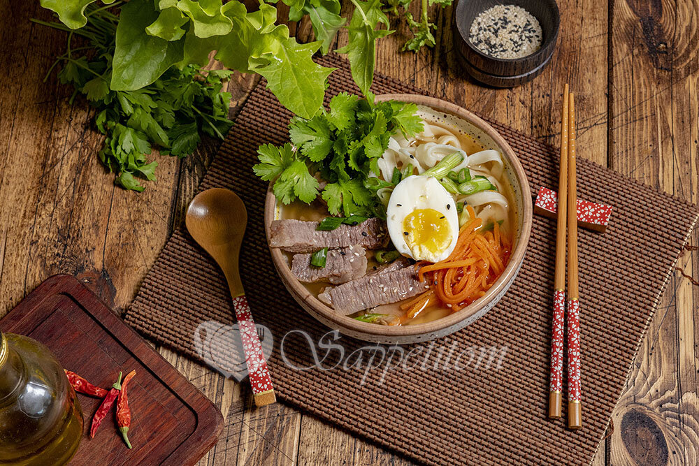 Ингредиенты Рамен пошаговый рецепт с фото 1 Приготовление супа Рамен начнем с бульона. В кастрюлю выкладываем говядину, морковь натертую на терке для моркови по-корейски и очищенную луковицу. Заливаем все водой и варим около часа на медленном огне. 2 Корень имбиря очищаем и крупно режем 3 Добавляем в бульон корень имбиря и соевый соус. 4 Добавляем сахар по вкусу, и варим еще минут 5. Попробуйте на вкус и при необходимости добавьте сахара или соевого соуса. 5 Теперь сварим яйца в мешочек. Моем и кладем в кастрюльку 2 куриных яйца. Заливаем холодной водой и ставим на сильный огонь. Доводим до кипения, снижаем нагрев почти до минимального и варим куриные яйца около 3-4 минут после закипания. После этого остужаем их под холодной проточной водой в течение нескольких минут. 6 Теперь приготовим лапшу согласно инструкции на упаковке. Вообще Вы можете приготовить лапшу заранее и хранить ее в отдельном боксе в холодильнике. Так же как и бульон сварить впрок. А перед подачей просто разогреть буль