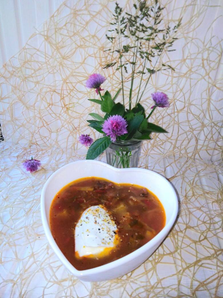 #готовимвместе Ингредиенты: говяжьи кости для супа, капуста, картофель, средняя морковь, средняя свекла, крупная луковица, крупный помидор, замороженный перец, кетчуп, сахара, соль , лимонного сока, зелень петрушки, лука, чеснока Способ приготовления: Суповые кости промыть, положить в кастрюлю с кипящей водой. Снимать появляющуюся пену и варить 1 - 1,5 (чтобы мясо отделилось от костей). За 15 минут до готовности посолить. Вынуть кости из кастрюли, остудить, отделить мясо и нарезать его порционными кусочками. Бульон процедить, поставить на огонь. Картофель очистить, порезать, положить в кипящий бульон. Капусту тонко нашинковать и добавить к закипевшему картофелю. Пока они варятся - приготовим зажарку. Луковицу порезать мелкими кубиками, морковь натереть на крупной тёрке. Спассеровать лук и морковь до мягкости, добавить болгарский перец (доедаем заморозку), тушить под крышкой 3 минуты. Свежую свёклу натереть на крупной тёрке, помидор нарезать крупными кубиками и добавить на сковороду к л