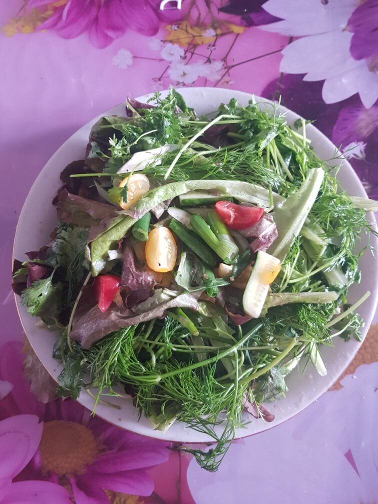 Долго думала выложить ли этот рецепт. Мы его очень любим. Может кому и понравится. Можно кушать руками. Конечно, делаю для своей семьи. Зелень использую всякую , разную.в любых пропорциях. #салат #закуска #зелень Ингредиенты: Листья салата, Укроп, Петрушка, Помидор, Огурец, Лук зелёный, Кориандр, Кервель, Масло растительное, Соль, Приправа роллтон Способ приготовления: Все ингредиенты помыть, дать стечь воде. Помидоры порезать. Огурцы порезать брусочками. Лук режем длинными полосками. Остальное крупно режем или оставляем целыми листочками. Всё смешать, заправить роллтоном (можно и без него), солью и маслом, размешать. Можно настоять. Часто добавляю мокрицу (она вкусом свежей кукурузы), крапиву (ошпариваю кипятком). Выкладываю на большое блюдо. Строго не судите, что-то не нравится, просто не делайте. Мы любим зелень и много её едим. Ну а если кому понравится, жду фотоотзыв. Приятного аппетита!