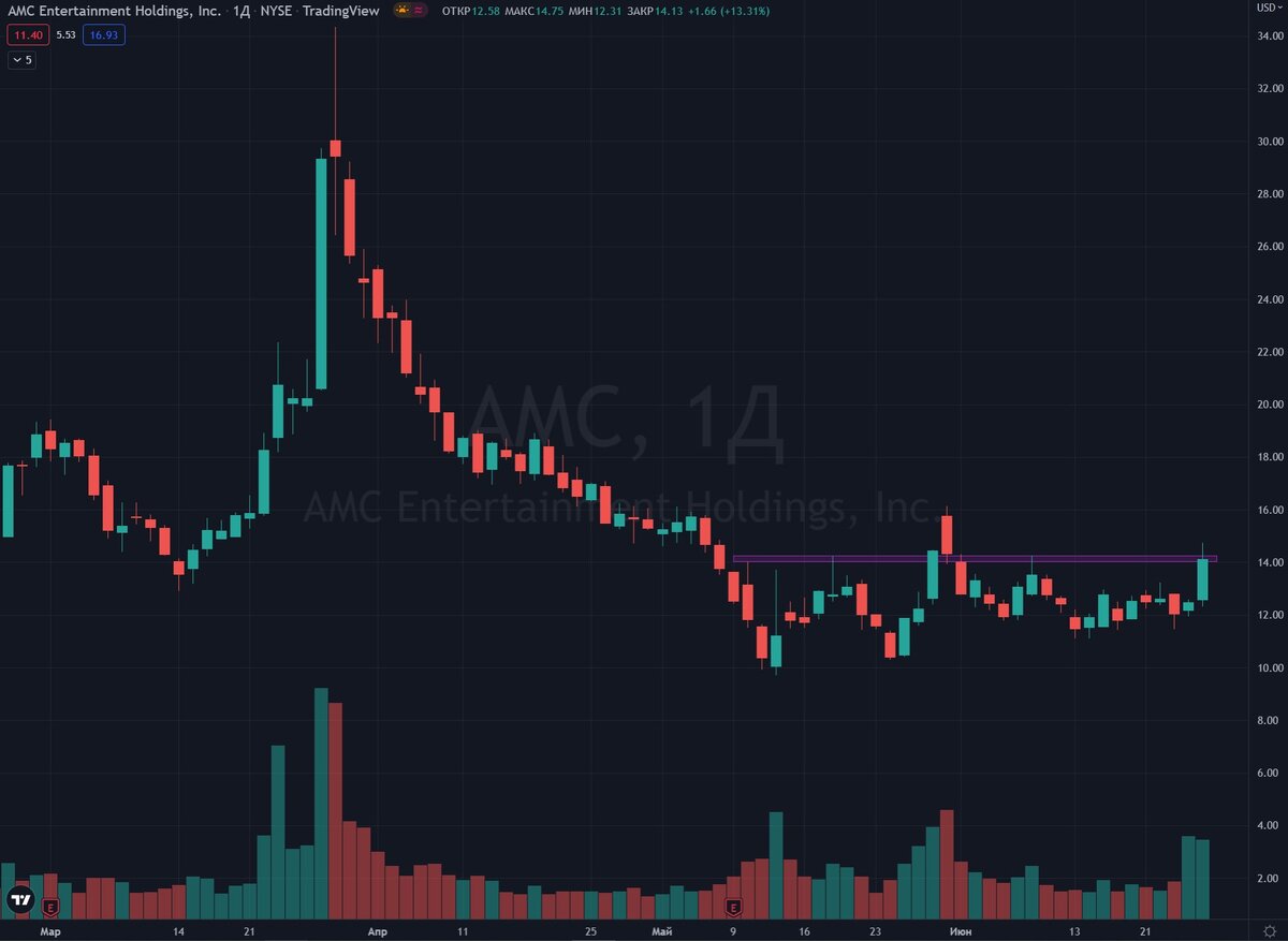 В понедельник акции AMC Entertainment $AMC выросли на 13,3% и протестировали уровень сопротивления в районе $14. Рост связан со включением AMC в индекс Russell 1000 и успешным прокатом кинокартины «Топ Ган: Мэверик», которая за месяц собрала больше 1 млрд $. На профильных сайтах и форумах народ говорит о том, что бумажки AMC нужно выбрать, так как после пробоя уровня они неплохо подрастут. С точки зрения технического анализа, это вполне возможно, но только не стоит забывать, что AMC относится к разряду «meme stock». Следовательно, прикупив пару акций нужно брать первый импульс, так как рыночная толпа не способна организовать устойчивое трендовое движение.
