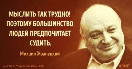 1. «Мыслить так трудно! Поэтому большинство людей предпочитает судить» (М. М. Жванецкий). 2. «Какой легкобанальный Ми-Ми. Как будто суждение уже и не мысль», — подумалось мне. И через некоторое время я получил на своё суждение лёгкую вразумляющую острастку от Семёна Клейнера: «Если уже анализировать сказанное, то Михаил Михайлович (вероятно) имел в виду не «рассуждение», а «осуждение»». За что я С. Клейнеру, конечно же, благодарен. Ибо утро обещает стать занятным! Поэтому займусь нашим одесским москвичом всерьёз. 3. Не надо предполагать, что имел в виду писатель. Если он не может выразить в слове то, что хочет выразить, он слабый профессионал. И тогда он не писатель, а субъект косноязычия. Поэтому работаем со сказанным, а не с тем, что хотел сказать сказитель да вот де сказочка кончилась. Как суждение вообще, так и осуждение молвы или даже решение суда выражается в виде суждения. А суждение неизбежно и всегда есть мысль. Вот и Ми-Ми в данном тексте выразил мысль (суждение), делящую лю