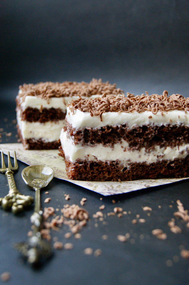 Это очень вкусное нежное пирожное понравится любителям медовика! Бисквит шоколадный, с ярким оттенком мёда, дополненный сливочным кремом не оставит равнодушным ни одного сладкоежку!!! Бисквит: ▪️ 4 яйца ▪️ 150 гр. сахарного песка ▪️ 70 гр. мёда ▪️ 10 гр. разрыхлителя ▪️ 3 ст. л. какао ▪️ 150 гр. муки Яйца и сахар взбиваем, добавляем мёд и снова взбиваем. Просеиваем туда какао, разрыхлитель и муку, перемешиваем аккуратно лопаткой, переливаем в прямоугольную рамку и выпекаем при 180’ около 45 минут, остужаем. Крем: ▪️ 500 гр. творожного сливочного сыра ▪️ 200 гр. сметаны 25% ▪️ 4 ст.л. сахарной пудры Сыр и пудру взбиваем, добавляем сметану и хорошо взбиваем в пышный крем. Сахарной пудры можно взять побольше, если вы сладкоежка 🤗 Сборка: Собираем в рамке, в которой пекли бисквит, предварительно установив её на доску. Бисквит разрезаем вдоль пополам, укладываем половину в рамку, пропитываем молоком, выкладываем половину крема, далее опять бисквит, молоко, крем. Закрываем пищевой плен