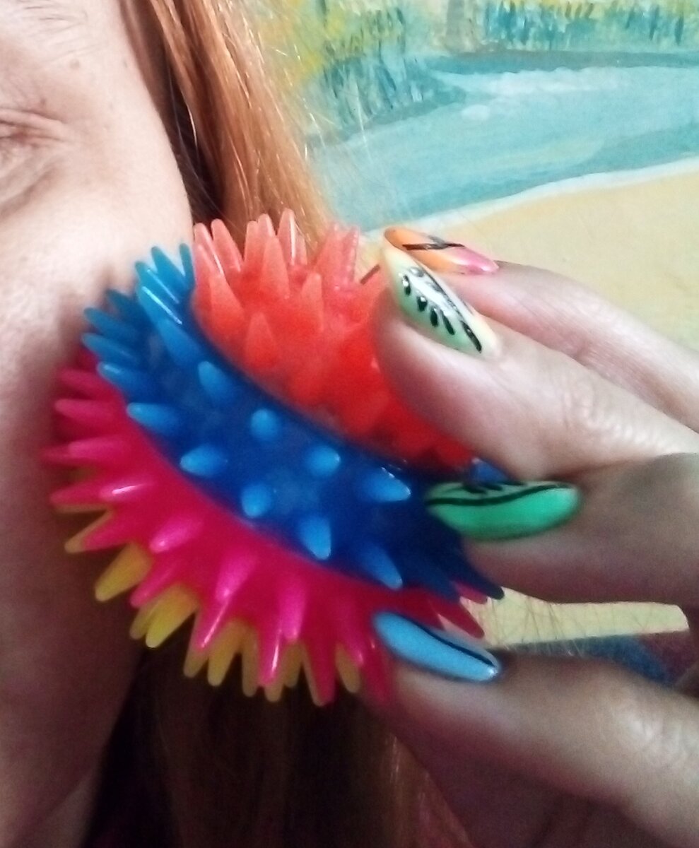 Массажный мяч с шипами очень хорошо расслабляет все зоны лица. Лучше всего работает кровоснабжение на лице после выполнения упражнений мячом. При выполнении манипуляций с мячом, необходимо придерживаться некоторых условий: На подбородке давление можно сделать более сильным, так как эта зона не слишком деликатная. Выполняем от середины подбородка до уха. В данном случае ещё и развивается мелкая моторика рук, пальцев. Кстати, такой массаж очень хорошо успокаивает, и поэтому его можно делать перед сном. Далее можно переходить к проработке брылей. Так же выполняется по массажным линиям. По массажным линиям можно не только катать вверх-вниз, но и вращать мяч по кругу. Главное, чтобы не было дискомфорта от упражнения. Можно выполнять с одним мячом, а лучше всего использовать два массажных мяча и выполнять манипуляции синхронно. Прорабатываем носогубные складки. Захватываем морщины марионетки. Если нет, то прорабатываем для профилактики. Можно пройтись по линиям губ. Важно уделить внимание у