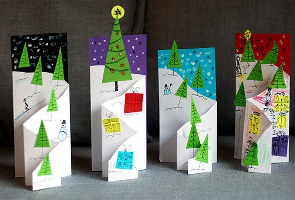 А вы все еще дарите открытки с теплыми пожеланиями? По мне так, это очень милая традиция, а уж если открытка сделана собственными руками - вообще супер. Ну, про мое отношение к предпраздничному периоду прокрастинации на работе я уже писала, так что просто продолжу подкидывать всем вокруг идеи, чем заняться на работе, когда заниматься, в общем-то, и нечем! Вам не нужно навыков художника, достаточно свободного времени, горячего желания поздравить кого-то и... немного бумаги. Инструкцию я нашла на сайте krokotak.com, у них и группа ВКонтакте есть (почему-то тоже на английском языке). Но тут и без слов всё ясно :-) Ножницы и клей-карандаш тоже понадобятся! Не предупредила раньше, но лучше узнать позже, чем никогда! Если нет зеленой бумаги (или тетрадной обложки) под рукой, сойдет разрисованный зеленым маркером лист плотной бумаги. Ну а сугробы и снеговиков может нарисовать даже детсадовец. Кстати, а вас тоже учили их рисовать в детском саду? Наверняка да, просто мало кто освежает эти навы