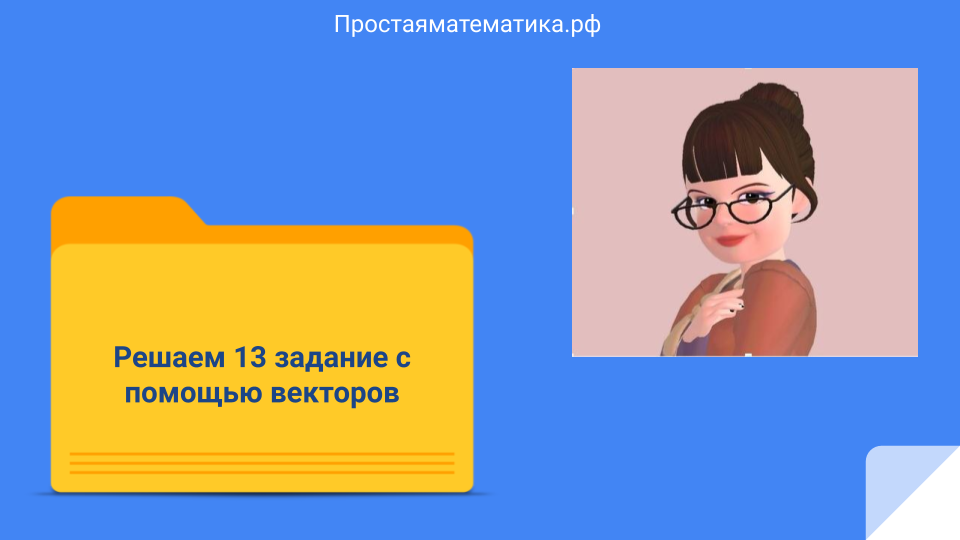 Всем привет. Рада видеть вас на канале Простаяматематика.рф Сегодня 13 - е задание разбираем с помощью векторов Чтобы решить эту задачу векторным способом нужно: 1. Ввести систему координат. 2. Найти координаты направляющих векторов данных прямых. 3. По формуле косинуса угла между векторами находим косинус угла между направляющими векторами. Важно: за угол между прямыми принимают меньший из двух углов, образованный этими прямыми, поэтому косинус угла между прямыми должен быть больше нуля Пусть длина каждого ребра равна 2а Введем систему координат Началом возьмем точку пересечения диагоналей основания пирамид. Найдем координаты необходимые для пункта а Но для начала найдем высоты пирамид EO и FO Еще раз отмечу, что хоть и у нас получилось я отрицательным в ответе нужно указывать положительное значение косинуса и выбирать меньший из двух углов. Поэтому здесь будет так: Наименьший угол будет не 120, а 60. Аналогично и в пункте б) мы берем положительное значение косинуса. Для те