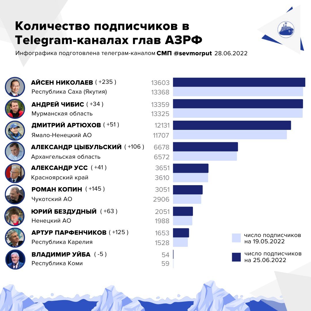 Число подписчиков в Telegram-каналах глав регионов АЗРФ в июне росло. Исключением стал лишь канал главы Коми Владимира Уйбы, потерявший 8,5% читателей. Напомним, что 10 июня над Уйбой начался суд — депутат Госдумы РФ Олег Михайлов подал против него иск о защите чести и достоинства. Большой отток также наблюдался у лидирующего в Арктике канала главы Якутии Айсена Николаева. По итогам месяца его канал прирос на 1,8%, но с 16 по 20 июня в канале наблюдалась аномалия - за четыре для отписалось почти 300 человек. Мы уже обращали внимание на признаки накрутки подписчиков в канале якутского главы. Это — ещё один характерный симптом. Второе место в тройке лидеров занимает губернатор Мурманской области Андрей Чибис. Показатели его канала остались практически на прежнем уровне, прирост составил всего 0,3% — это меньше всех в АЗРФ. Замкнул Топ-3 глава Ямало-Ненецкого АО Дмитрий Артюхов, прибавивший 3,6%. Это также и третье место по темпам прироста. Ранее мы отмечали, что канал главы ЯНАО набрал п
