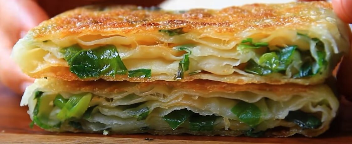 Сегодня я поделюсь очень быстрым рецептом без дрожжей! Никакой духовки! супер просто и вкусно! 95 мл воды 1,5 г соли смешать хорошо, 150г муки всыпать в воду, хорошо смешать, замесить тесто руками, тесто накрыть крышкой и дать отдохнуть в течение 10 минут. Через 10 минут разделить тесто на 4 части, сформируем каждый кусок теста в шарики, накрываем крышкой и даём отдохнуть ещё 5-10 минут. Нарезаем немного свежего зеленого лука, чтобы использовать его для этого рецепта! Вымойте и нарежьте зеленый лук. Положите нарезанный зеленый лук в миску. Добавьте щепотку пищевой соды к зеленому луку, приготовьте немного сыра. 1/4 стакана муки и 1/4 стакана кукурузного крахмала хорошо перемешайте. Присыпьте стол немного смесью муки и кукурузного крахмала. Возьмите кусок теста разровняйте его рукой. Раскатайте тесто скалкой, диаметр теста составляет около 18 см. После раскатки теста, присыпьте его немного смесью муки и кукурузного крахмала. Повторить то же самое с другими кусками теста. Положит