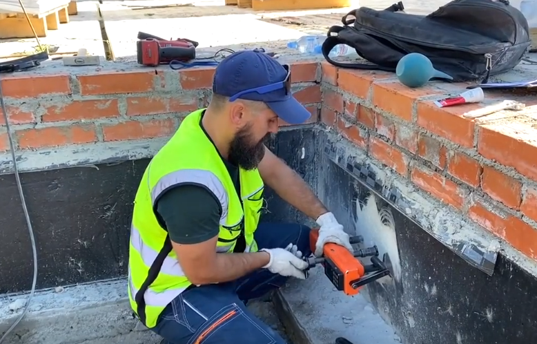 На небольшом участке предварительно убирается гидроизоляция и сначала производится проверка косвенных характеристик с помощью прибора ОНИКС 2.5 Этот электронный склерометр позволяет определять фактический класс бетона.