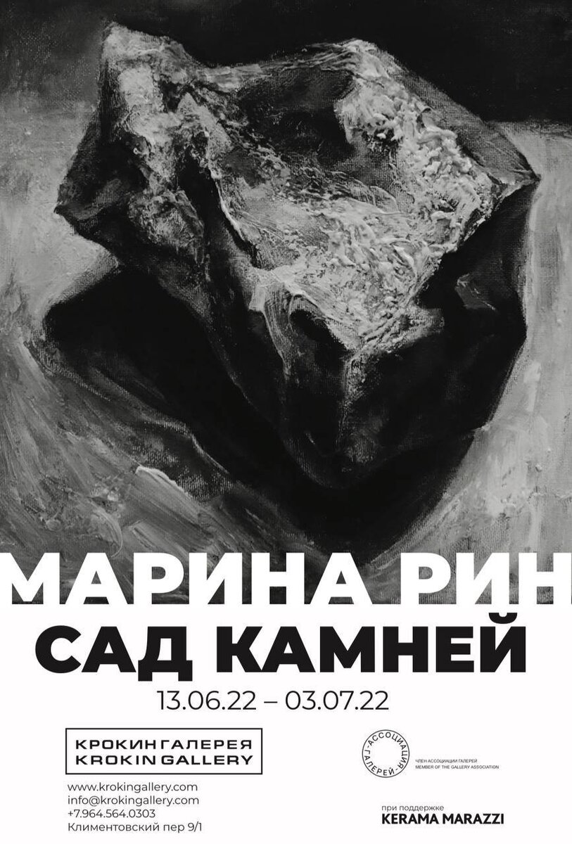 Само название выставки «Сад камней» (карэсансуй) в буквальном переводе с японского означает «сухие горы и воды». И если в прошлый раз в фокусе интересов Марины Рин был образ воды («Aqua» - название выставки), то сегодня – это камень, точнее «Сад камней». Взаимосвязь двух авторских высказываний очевидна. Перед нами единая художественная программа и выверенная в своих координатах система, что отличает директорию искусства Марины и её стратегию. Новые произведения это наглядно демонстрируют, определяя авторское высказывание чёрно-белой, лишённой цвета живописью, оперирующей исключительно базовыми константами. Если говорить о доминанте её искусства, о многолетней idée fixe, то это интерес к миру материи, её природе, с непременным арсеналом визуальных признаков - игрой поверхности, структурой и, безусловно, энергией, неведомым образом сжатой внутри кристаллической решётки. Этот акцент на природе материи - элемент, но очень важный в приоритетах её художественных установок, её «артистичес