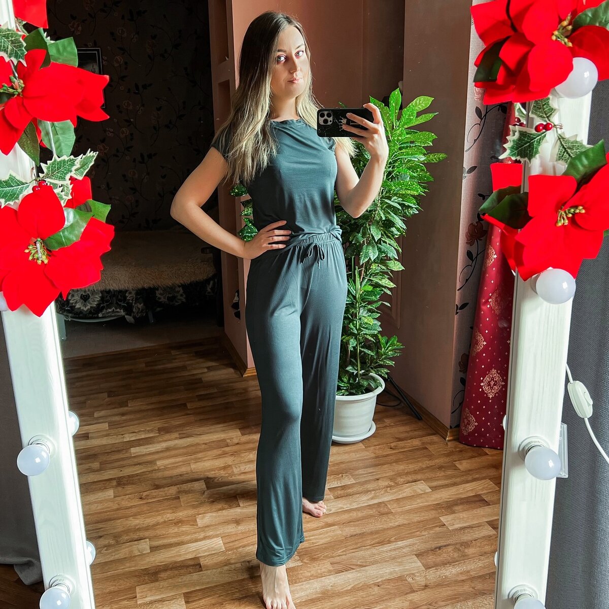 Очень лёгкий, мягкий, комфортный комплект для дома или сна: футболка и штаны. Ткань тонкая, прохладная, даже летом в таком комплекте не жарко. Заказывала на AliExpress в магазине I Esam Store. По ссылке в наличии 9 расцветок. Доставка длилась 3,5 недели. Трек номер отслеживался. На параметры 84/64/92 прекрасно подошёл размер М. Комплект прямо-таки струится по фигуре. Внимание: этот пост содержит рекламные ссылки (если их можно таковыми назвать). Вещь куплена мной на AliExpress, все фото мои, мнение о товаре тоже моё. Прямая ссылка на товар на AliExpress: https://aliclick.shop/r/c/1rdw77kfuny5gw9p Присутствовали фабричные бирки и ярлычки. Материал: полиэстер, спандекс. Ткань эластичная, тонкая, но не просвечивает. Штаны на резинке, завязки просто для красоты, фасон немного расклешенный к низу. Качество отличное. К покупке рекомендую!)) Если вам интересны обзоры товаров с AliExpress, если вы хотите стильно одеваться и при этом тратить минимум средств, вам интересны различные полезные н