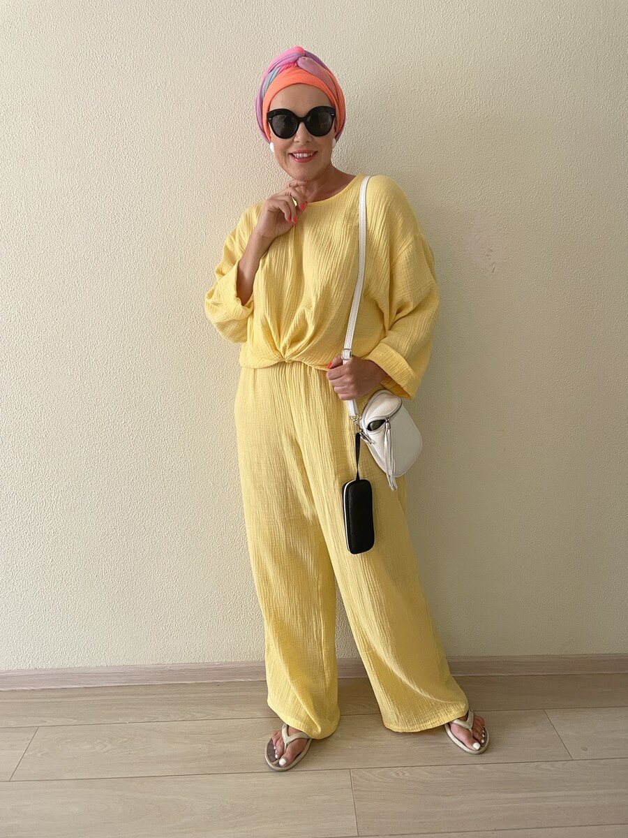 Здравствуйте, дорогие читатели! У меня много самой разной одежды, но все-таки летом я по большей части отдаю предпочтение натуральным тканям, в частности, моделям из льна и муслина. Каждый раз, когда я надеваю одежду от бренда voishe, вы спрашиваете у меня явки и пароли. А так как недавно я как раз приобрела у них два костюма, появился повод о них рассказать и, разумеется, показать свои новинки. Подписывайтесь на меня в телеграм и заходите в магазин аксессуаров. Не забывайте ставить лайк за мои старания! Voishe - это льняной бренд, который шьет готовые образы: рубашки-кюлоты, рубашки-шорты, платья-кимоно, юбки и топы. С ним я знакома уже не первый год, поэтому могу советовать - качество пошива и актуальность моделей на высоте. Впрочем, ваши вопросы - хорошее тому подтверждение. Например, про желтый костюм из муслина, который вы видите на фото, не спросил только ленивый. Недавно, как вы знаете, я была в Абхазии, и костюм приобрела именно для этой поездки. Могу сказать, что ничего более