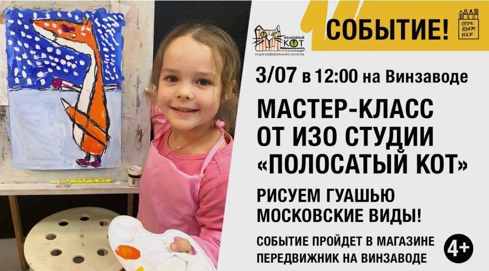 💥 💰 Бесплатно, по предварительной регистрации 3 июля в 12:00 магазин Передвижник совместно со студией изобразительных искусств «Полосатый кот» проведет мастер-класс для детей от 4-х лет! Тема: Котики гуляют по Москве". Детки будут рисовать московские виды. 📌 В программе: - интересный мастер-класс гуашью от художника студии изобразительного искусства «Полосатый кот»; - новые знакомства и общение; - чай, кофе и конечно же печеньки; - яркие эмоции; - фотографии на память с полосатым котом; 📍 4-й Сыромятнический пер., д. 1/8с9, ЦСИ Винзавод ЗАРЕГИСТРИРОВАТЬСЯ: https://afisha.timepad.ru/event/2083841 #бесплатно #мастер-класс #рисование для детей