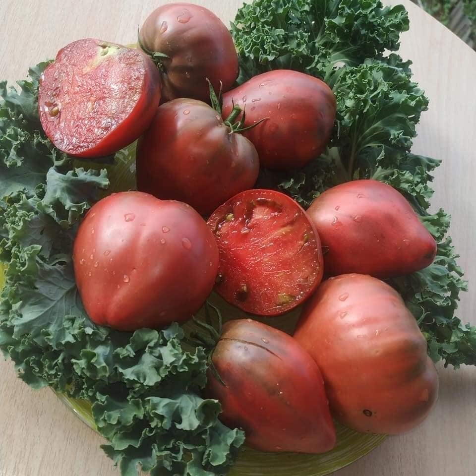 Добрый вечер, друзья! Хочу познакомить вас с красивым и вкусным томатом Лонгхорн. Куст высокий, до 2 м, полураскидистый. Плоды бордово фиолетовые 150-300 гр, сердцевидной формы, в кисти 6-8 помидор, очень вкусные