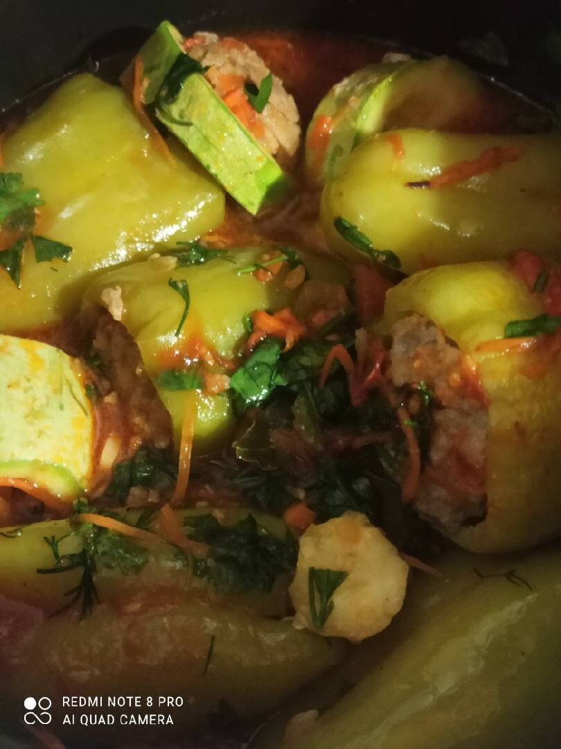 Зажарку кладём в перцы и кабачки, продолжаем тушить.