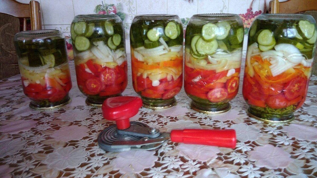 Ингредиенты: ☘огурцы и помидоры - сколько уместится;, ☘морковь , ☘зонтики укропа , ☘чеснок , вода , соус "Чили" , столовый уксус (9%) , сахар , соль Способ приготовления: 1. Морковь и чеснок нарезать кусочками. 2. На дно банок положить по зонтику укропа, несколько кусочков моркови и чеснока. 3. Огурцы вымыть и удалить кончики. У помидоров отрезать "кончики". Уложить овощи в банки. Сколько уместится. 4. Вскипятить воду с сахаром и солью, добавить соус "Чили" и уксус. 5. Залить банки маринадом. 6. Поставить стерилизовать в кипящую воду на 10 минут. 7. Закатать и перевернуть до полного остывания. Приятного аппетита! Не забудьте подписаться!