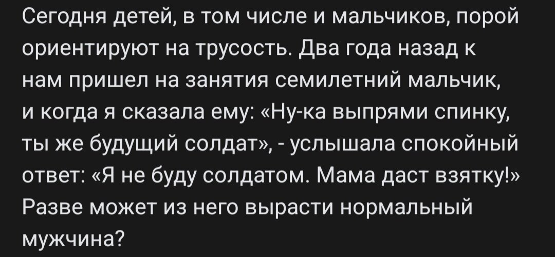 Добрый день, мои дорогие читательницы и читатели. "Ты будущий солдат" – такой пост я сегодня прочитала. Как женщине, у которой растёт сын и которому тоже семь лет – резануло где-то внутри. Ай-ай-ай, как не хорошо. Знаете, есть такая профессия Родину защищать. И к этому должно быть призвание, желание и умение. А для галочки – нет пользы никому. У меня много братьев, двоюродных. Три пошли в армию, а один не пошёл. Почему не пошёл и как ему это удалось – ничего не знаю, ничего вижу и ничего не скажу. Из тех кто пошёл: один пошёл по контракту, второй до сих пор по контракту служит. Один разочаровался, второй видит для себя перспективы. Тот, который не пошёл – ничего не потерял. Учился, нашёл хорошую работу и живёт очень хорошо. У меня есть сын. 7 лет. Армия меня страшит. Ну опять же, решение будет принимать он. Если не захочет и будет видеть для себя другие решения этой проблемы – это его выбор. Нет, это не трусость, это выбор. У меня папа бывший военный и бывает, его заносит. Начинает