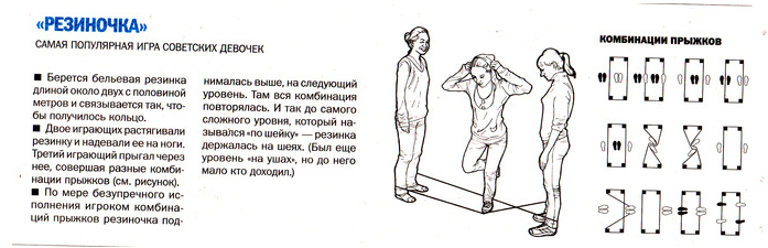Исходное положение: лицом к резиночке. Прыгаем на дальнюю половинку резинки, прижимая ее двумя ногами к земле. Ближняя половина резинки при этом должна зацепиться за ноги. Выпрыгиваем за пределы резиночки. В другом варианте необходимо не напрыгнуть, а перепрыгнуть через дальнюю половину резиночки.