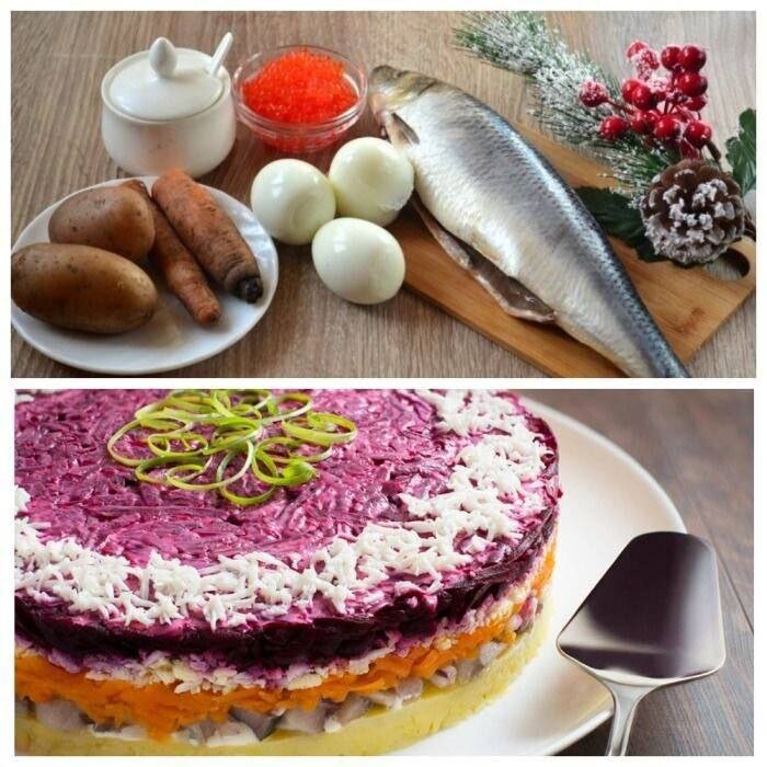 Ингредиенты: — селёдка — картошка — свёкла — салатный белый лук — морковь — домашний майонез Приготовление: 1. Морковь и картофель я отвариваю, а вот свёклу запекаю в духовке. 2. Селёдочку лучше всего брать жирную 3. Почистить от шкуры, выпотрошить и вытащить все кости из рыбы, нарезать её небольшими кубиками. Картофель и морковь так же нарезаю кубиками, а свёклу натираю на тёрке, лук режу очень мелко. 4. Сначала картофель смешиваю с майонезом и выкладываю нижним слоем, затем тонкий слой лука, сверху слой селёдки, потом слой моркови, смешанной с майонезом и завершаю всё слоем свёклы с майонезом. 5. В холодильник на пару часов и потом можно подавать на стол. Приятного аппетита!