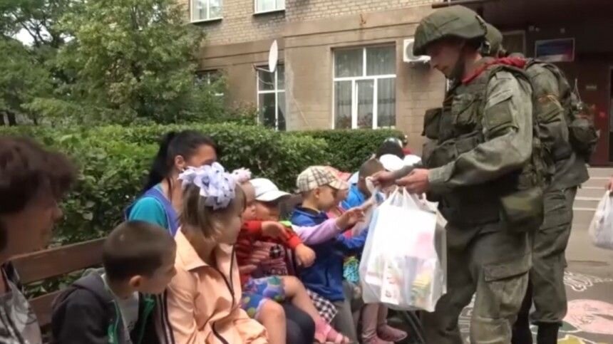 Ребята также подготовились — вручали рисунки и читали стихи. С некоторыми детьми российские военные уже знакомы. Они вывозили их из-под обстрелов украинских националистов.