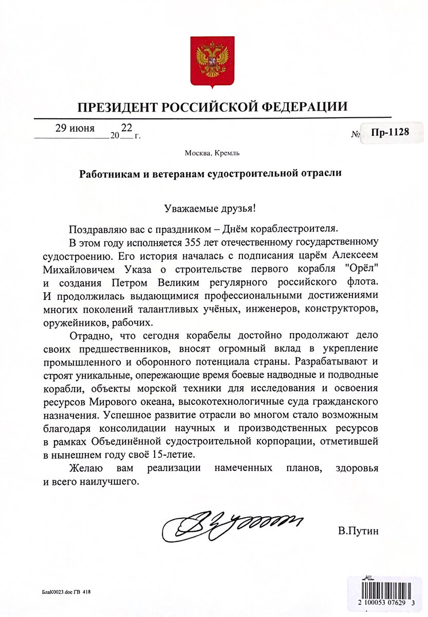 Уважаемые друзья! Поздравляю вас с праздником – Днём кораблестроителя. В этом году исполняется 355 лет отечественному государственному судостроению. Его история началась с подписания царём Алексеем Михайловичем Указа о строительстве первого корабля "Орёл" и создания Петром Великим регулярного российского флота и продолжилась выдающимися профессиональными достижениями многих поколений талантливых учёных, инженеров, конструкторов, оружейников, рабочих. Отрадно, что сегодня корабелы достойно продолжают дело своих предшественников, вносят огромный вклад в укрепление промышленного и оборонного потенциала страны, разрабатывают и строят уникальные, опережающие время боевые надводные и подводные корабли, объекты морской техники для исследования и освоения ресурсов Мирового океана, высокотехнологичные суда гражданского назначения. Успешное развитие отрасли во многом стало возможным благодаря консолидации научных и производственных ресурсов в рамках Объединённой судостроительной корпорации, от