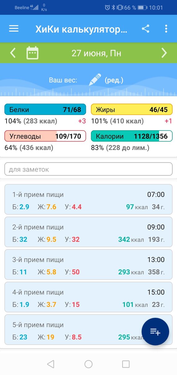 Привет, дорогие читатели! Да-да, сегодня утром весы показали опять цифру 70,8 кг. Такая цифра была до зажора на 12 июня. То есть 3 недели назад... Всю эту неделю стараюсь питаться правильно. Белки и жиры в полном порядке. Углеводов мало, но это и к лучшему. В понедельник была такая таблица: Вчера, во вторник, почти то же самое: На первый завтрак съедаю один горячий бутерброд с черным чаем без сахара. Везу ребенка в детский сад. Потом приезжаю домой и завтракаю второй раз, уже более плотно. Разогреваю сырники, ем их со сметаной и запиваю черным чаем без сахара. И еду на работу. Обедала вчера отварной картошкой без масла и соли, и огурцом. На полдник зеленый чай без сахара с двумя печеньками "Бельвита" На ужин сделала салат. Но все ингредиенты у меня лежат по разным тарелкам, и взвешиваю я это отдельно. После смешивания получается так. Очень сытно и вкусно! В понедельник было все то же самое, только на обед вместо картошки я доела гречку , тоже с огруцом. Сырники вчера закончились. Поэ