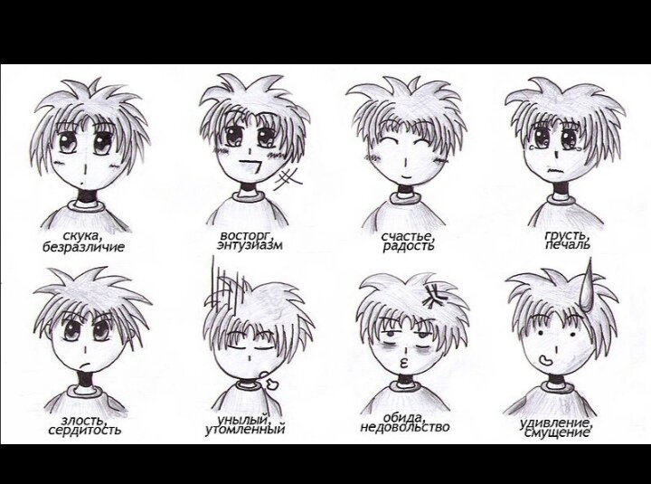Передача эмоций в аниме является поводом для отдельного разговора. Помимо традиционных для аниме видов проявления чувств персонажем — изменением выражения лица или тона его голоса, используется ряд других приёмов. Эмоции могут изображаться подчёркнуто нереалистично, гипертрофированно — персонажи говорят с закрытыми глазами, чтобы передать безапелляционность, или принимают картинно демонический вид, когда проявляют гнев. В комедийных ситуациях, с целью показать несерьёзность чувства, применяются пиктограммы, такие, как картинка «капельки пота» или «вздувшихся вен», возникающие поверх головы героя, либо в рамочке над ней. Помимо «серьёзного» рисунка существует также популярный стиль «тиби» или «super-deformed», в котором персонажи изображаются упрощённо, с непропорционально большими головами и глазами в пол-лица. Обычно стиль SD применяется в комедийных ситуациях, поскольку выдаёт явную несерьёзность, пародийность происходящего. Тем не менее, существуют сериалы, целиком сделанные в тако