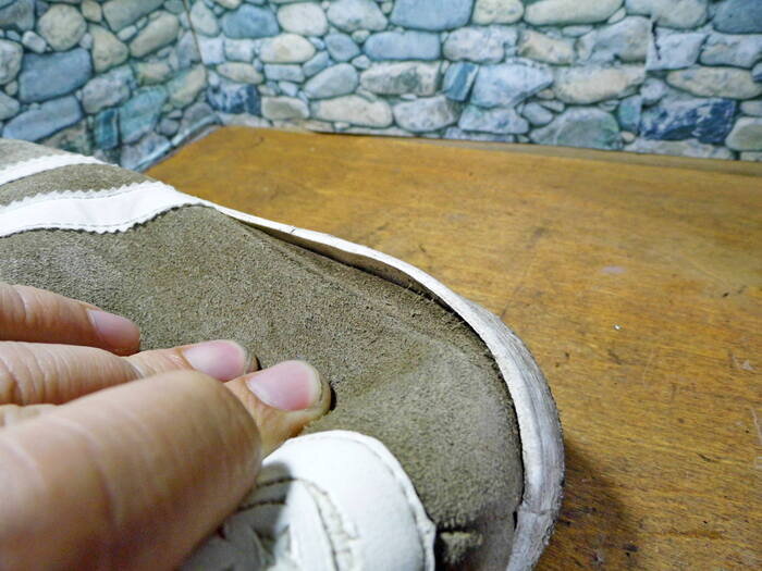 Кроссовки. Отклеивается верх от подошвы. Или отходит подошва от верха. Это как со стаканом. Такое обычно подклеивается полиуретановым клеем. Шприц в данном случае имеет ряд преимуществ перед кисточкой. Иногда (при мелких отклейках) это можно сделать самостоятельно: Как самостоятельно подклеить обувь? Таких кроссовок несколько пар. Практически идентичных. И один и тот же дефект. Отходит где-то больше, где-то меньше. Мы еще прошьём их по периметру. Для этого нам нужен крючок и прошивная нитка. Используем нить плоского плетения из полиэстера с пропиткой. Перед прошивкой достаём стельки. Пока шьём, давайте немного порассуждаем. Часто можно в каментах увидеть разные оттенки мыслей на тему может, проще новые?