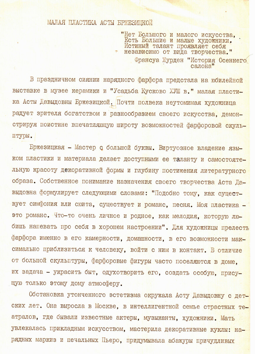 Бржезицкая – Мастер с большой буквы. Виртуозное владение языком пластики и материала делает доступными её таланту и самостоятельную красоту декоративной формы, и глубину постижения литературного образа. Собственное понимание назначения своего творчества Аста Давыдовна формулирует следующими словами: «Подобно тому, как существует симфония или сюита, существует и романс, песня. Моя пластика – это романс. Что-то очень личное и родное, как мелодия, которую любишь напевать про себя в хорошем настроении». Для художницы прелесть фарфора именно в его камерности, домашности, в его возможности максимально приблизиться к человеку, войти с ним в контакт. В отличие от большой скульптуры, фарфоровые фигуры часто поселяются в доме, их задача – украсить быт, одухотворить его, создать особую, присущую только этому дому атмосферу.