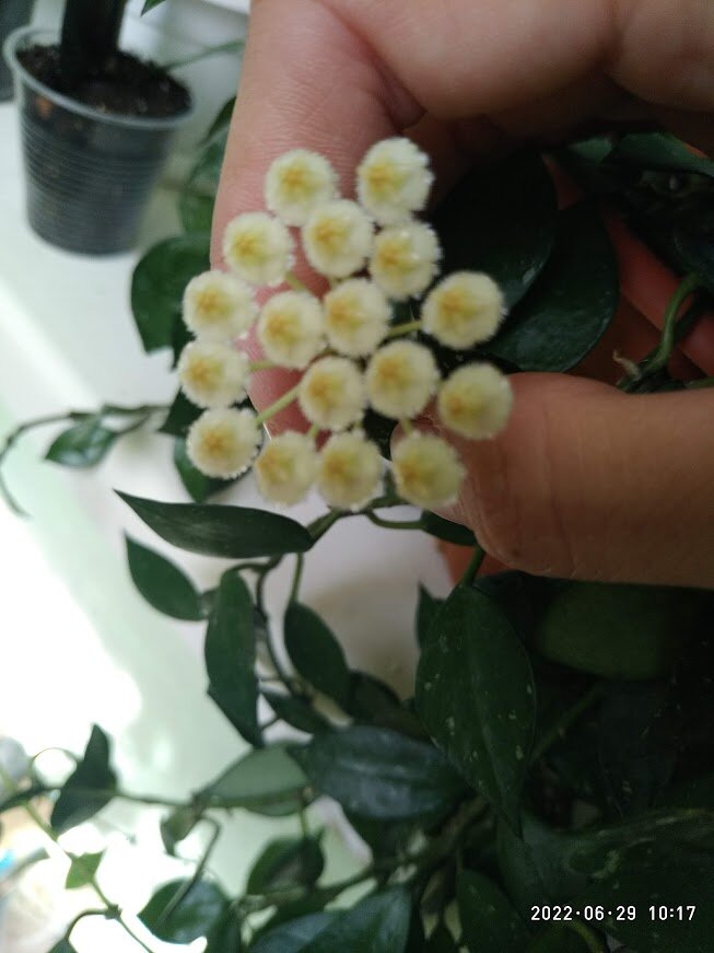 Хойи Лакуноза и Лакуноза Эскимо цветут одинаково, только отличаются листиками. Цветочки напоминают пушистых цыплят, а аромат просто волшебный (лично для меня). Некоторым людям не нравится, как пахнут данные виды хой. Простую лакунозу я покупала в феврале прошлого года и она уже с февраля этого года пыталась зацвести, но все время скидывала цветочки. Как потом оказалось, я ее просто мало поливала. Подкормив калием и увеличив полив, она наконец смогла порадовать меня своим цветением. Цветочки собраны в корзинку, но размер ее небольшой. Пахнет чем-то очень приятным, напоминает пломбир. Пока распускалось не более двух корзинок. Если будет больше, то наверное и аромат станет сильнее. Хойя стоит на восточном балконе, но не на прямых солнечных лучах, а на втором подоконнике. Ей вполне хватает и там света. Это листики обычной хойи лакунозы. Они небольшие и ничем особо не привлекают внимания. У лакунозы эскимо листики сплешные и более продолговатые, чем у обычной лакунозы. Эскимо я приобрела н