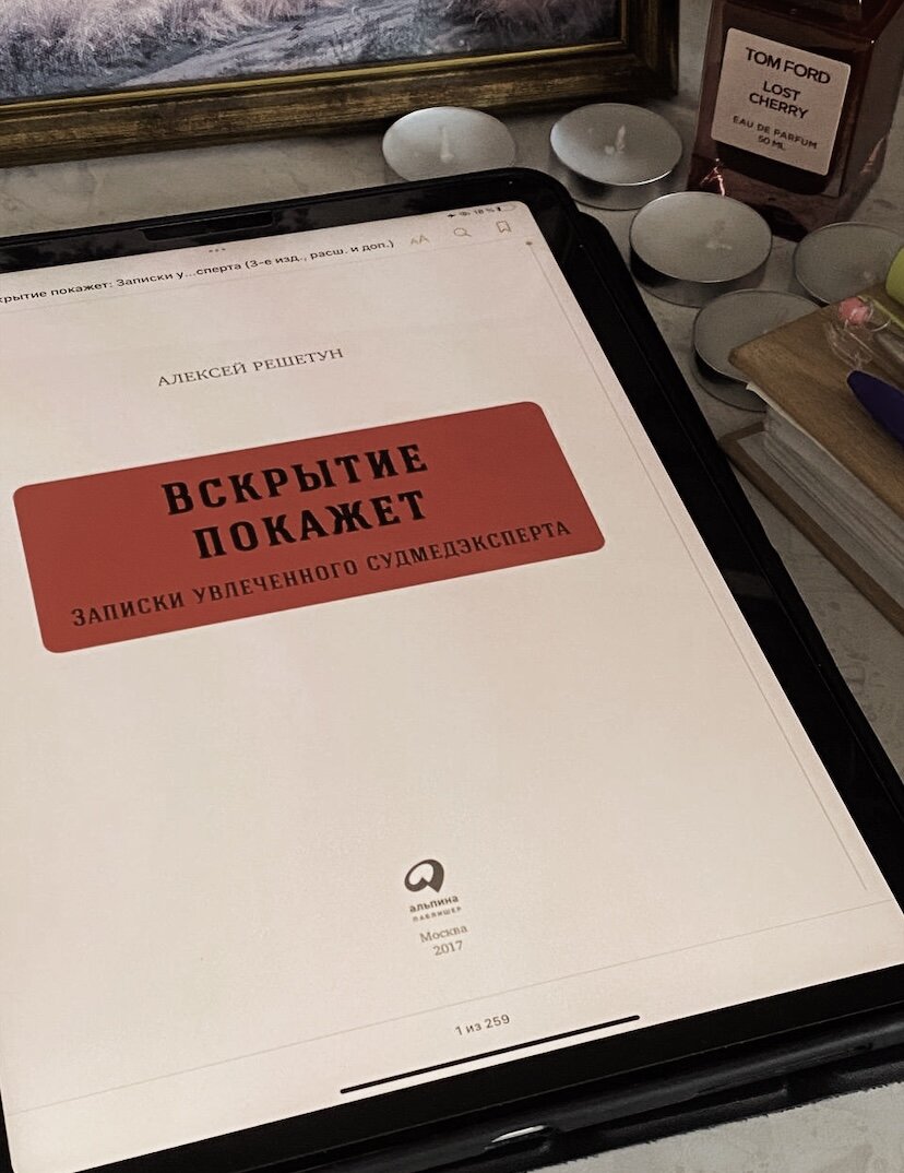 Я очень часто читаю различные книги, но редко их советую. Потому что, как говорится, на вкус и цвет. Но книгу Алексея Решетуна я просто не могу оставить без внимания. Ещё давно мне стало интересно, как именно происходит вся эта работа судебно-медицинского эксперта. Но как только я открывала огромный том с различными научными понятиями и сложными речевыми оборотами, желание отпадало на какое-то время. Совершенно случайно, гуляя по книжному магазину наткнулась на книгу «Вскрытие покажет. Записки увлечённого судмедэксперта» и отложила в свой личный список «прочитать позже». Ожидала, естественно, все тех же заумных слов и просто на просто материалов, которые напитывают нам в высших учебных заведениях. Но я очень удивилась, потому что содержание оказалось противоположным. Безумно интересная, книга, которую я советую прочитать каждому, кто хоть немного интересуется данной темой! Истории реального человека с реальной практикой: как и почему, в какой последовательности вс
