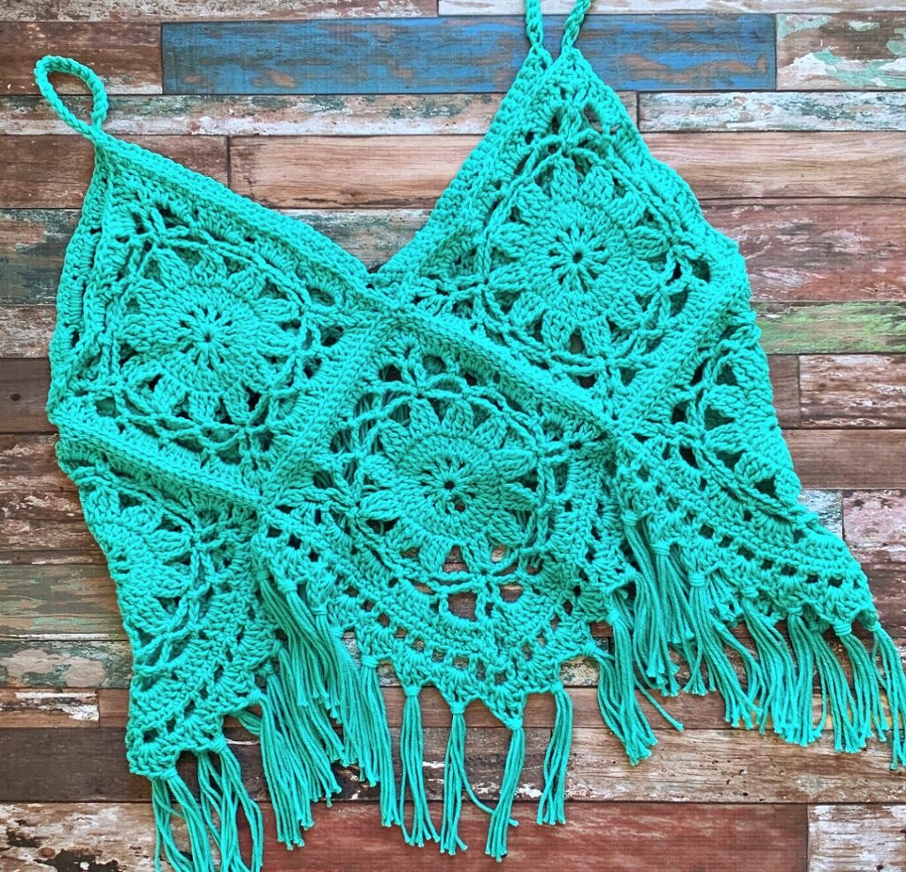 Этот красивый и яркий топ вяжется легко, схемы мотивов для вязания можно использовать любые какие Вам нравятся.