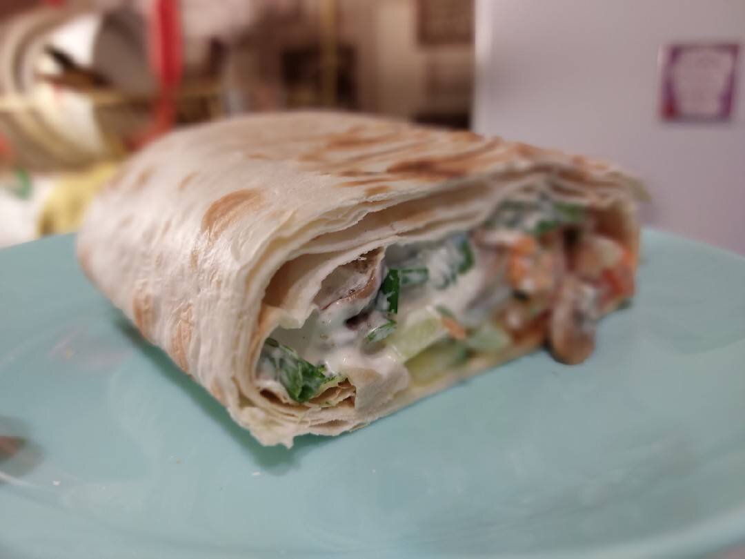 Ингредиенты: мяса птицы, шампиньонов, огурец, помидор, зеленого лука, корейской морковки, лаваша, Для соуса:, майонеза, сметаны, перец, чеснок, хмели-сунели Способ приготовления: Огурец, помидор нарезать кубиками дать постоять, чтобы сошла вся влага. Лук нашинковать мелко. Мясо порезать маленькими кусочками смешать с майонезом, посолить и оставить по мариноваться. Шампиньоны режем не мелко и обжариваем до готовности на быстром огне. Курицу так же обжариваем до готовности. Готовим соус, смешиваем майонез с сметаной, добавляем перец, чеснок сушеный и хмели-сунели приправу, даем соусу немного настояться, лучше приготовить соус за пару часов и тем самым лучше пропитался! Мясо обжарилось, смешиваем с жареными грибами и начинаем сворачивать ролл. Выкладываем помидоры, затем огурец. Далее корейскую морковку, далее мясо и соус. Посыпаем мелко нашинкованным зеленым луком и сворачиваем в рулет. Обжариваем по половине минуты с каждой стороны на сковородке гриль. Шаверма получается очень большая,