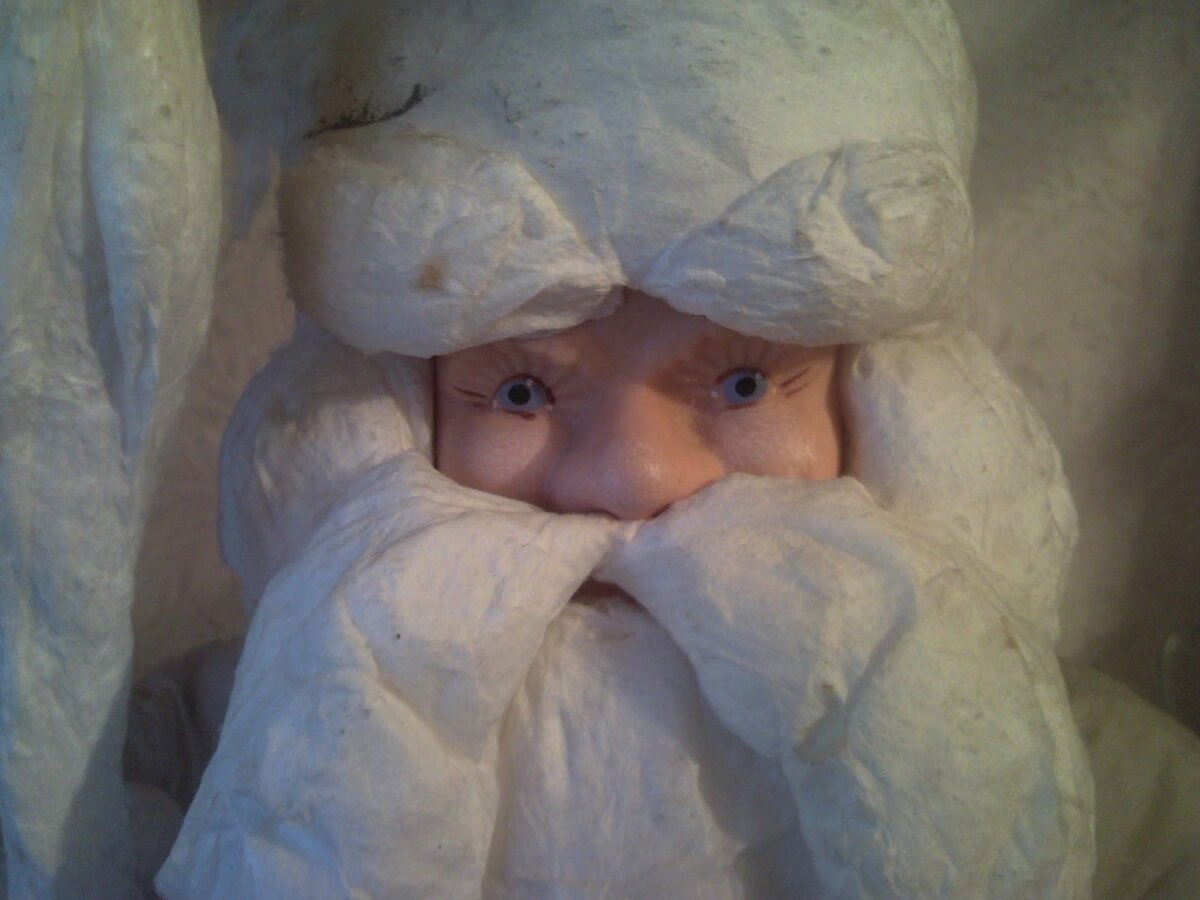 В 2012 году в жаркий летний день около мусорных баков был обнаружен старый советский ватный дед Мороз. Мы спрятали его в кусты и смогли вернуться за ним только вечером. Он дождался. #дедмороз #дедморозватный #ватнаяигрушка #дедморозретро Лицо у куклы оказалось резиновое и очень приятное. Сама кукла была чистая, сухая но с рваным верхним бумажным слоем, распушенной ватой, и вся засыпана мохнатыми кистями с тополей. Фанерную подставку я оторвала насовсем. Внутрь шубы вставила новый крепкий картонный конус : Работать с ватой я тогда не умела и не собиралась пока начинать. Так что вопрос стоял не о реставрации, а об обновлении куклы : выкроила шубу и шапку из подходящих серебристых обрезков и просто наложила сверху. Манжеты, воротник и отворот для шапки связала из остатков мохнатой пряжи. На бороду и усы наложила холофайбер : Получился парадный новодел, который в любой момент готов к реставрации в прежнем облике. Но я до сих пор не решила, буду ли восстанавливать прежний вид. Десять л