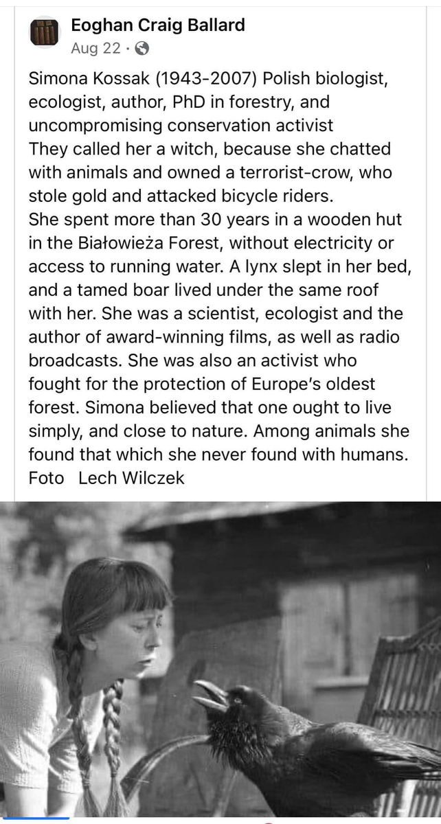 Симона Коссак (1943-2007) - польская биологиня, писательница, экологиня, кандидатка наук по лесоводству и отчаянная активистка-защитница природы. ее называли ведьмой, потому что она разговаривала с животными и жила с вороной, которая воровала золото и нападала на велосипедистов. она провела более 30 лет в деревянной хижине в Беловежской пуще, без электричества и водопровода. в ее кровати спала рысь, приручённый кабан жил под ее крышей. она была ученой, экологиней, создавала фильмы, снискавшие множество наград, а также радиопередачи. она боролась за сохранение самого старого леса Европы. Симона верила, что человек может жить просто и близко к природе. у животных она нашла то, чего не могла найти у людей 💖