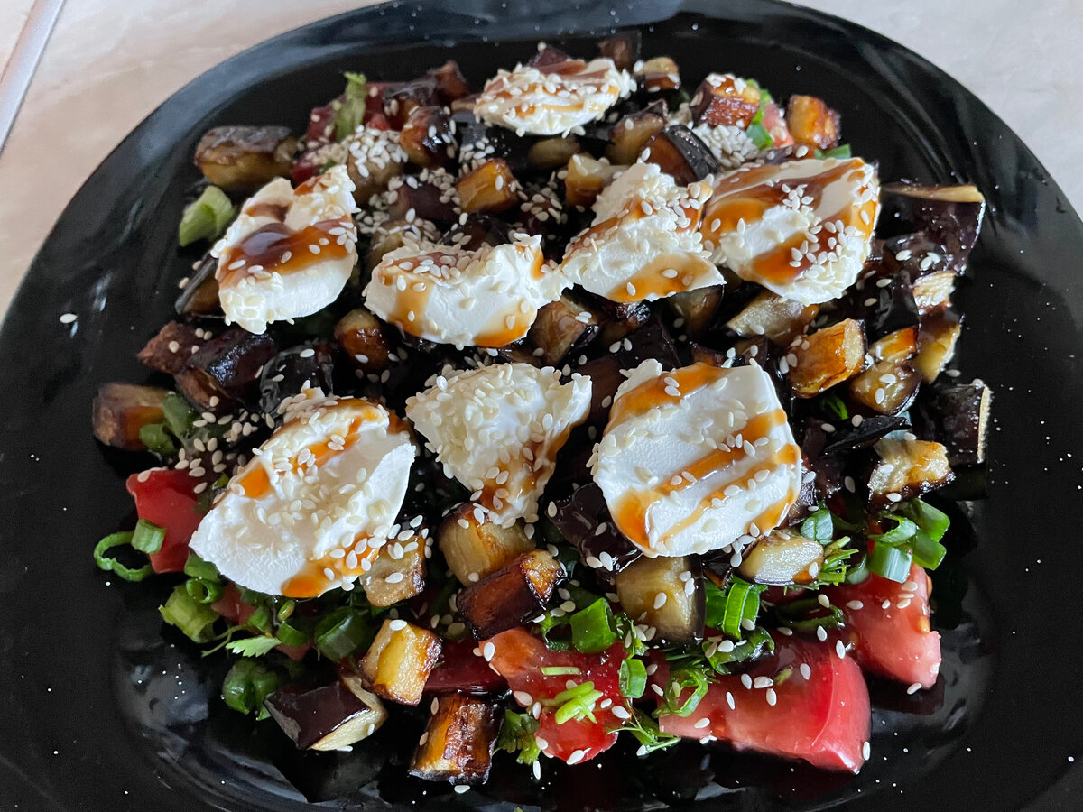 Без пяти минут грузинское блюдо, но на русско-московский манер любителя изысканной этнической кухни, легко и быстро приготовить теплый салат из помидоров, баклажанов и сыра. На приготовление от и до тратим десять минут, на выходе получаем блюдо уровня столичного ресторана. Из чего готовим? Как готовим? Нарезаем кубиками или как получится (но не кружочками) баклажан. Закидываем его в сковородку, слегка обжариваем в масле. С баклажана можно было снять кожуру, а можно и не снимать - кто как любит. Пока жарится баклажан, нарезаем помидоры и зелень. Выкладываем на тарелку вот так: Затем добавляем баклажаны: Сверху накидываем пару чайных ложек творожного сыра, поливаем соусом и посыпаем семечками кунжута. Готово!