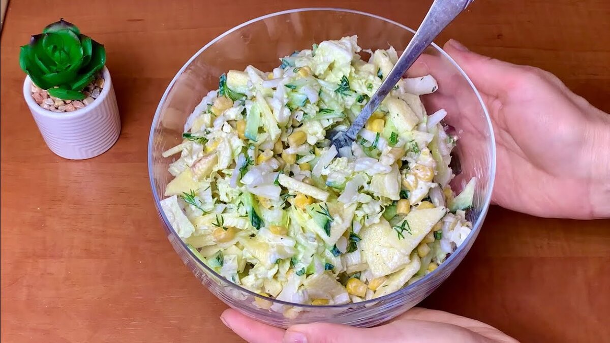 Для салата беру пекинскую капусту 250 граммов и нарезаю тонкой стружкой или соломкой также в салат добавим половину яблока. Яблоко очистим от сердцевинки, хвостика и кожуры яблоко порежем как и капусту тонкими пластинками чтобы яблоко не темнело и для приятного вкуса салата я полью его немного лимонным соком яблоко идет в салат также в салат добавим 1 свежий огурец огурец нарезаем сперва кружочками а затем соломкой также в салате будет зелень я нарезаю мелко пару веточек укропа и отправляю в салат и также добавлю пол банки консервированной кукурузы 140 граммов заправляю салат очень просто. у нас здесь уже присутствует лимонный сок, добавляю 3 чайные ложки соли или солим по вкусу, щепотку чёрного молотого перца и также добавляем три столовых ложки сметаны. жирность сметаны по вашему желанию, если хотите чтобы салат был максимально легким и не калорийным возьмите вместо сметаны белый йогурт. все перемешали и наш быстрый и вкусный салат готов за пять минут. в этом салате мне особенно