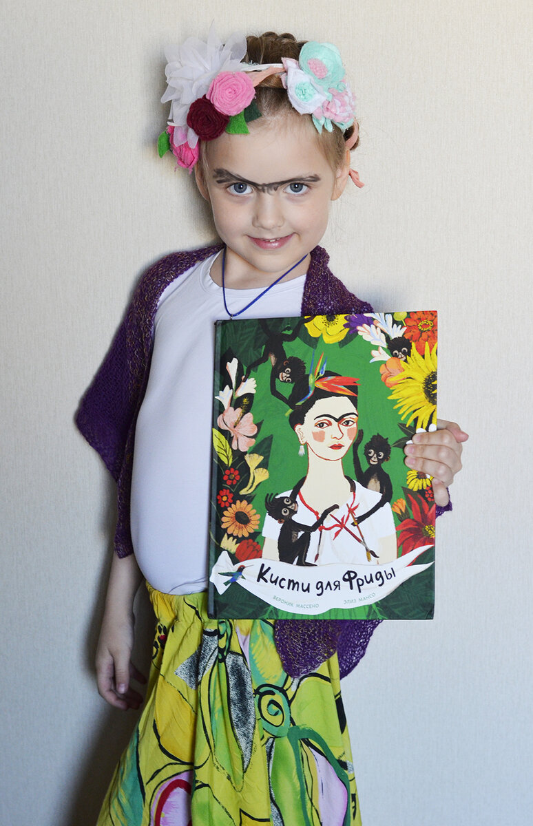 В издательстве «Поляндрия» вышла новая серия книг для детей про искусство. Сейчас в серии два издания. Автор - Вероник Массено выбирает известное произведение и придумывает к нему историю, которая заинтересует ребенка. Это хороший вариант для знакомства ребенка с уникальным и разнообразным миром искусства. Для «первого плаванья» я рекомендовала книгу Вероник Массено «Большая волна» с иллюстрациями Бруно Пилорже о работе Кацусики Хокусая из серии «Тридцать шесть видов горы Фудзи». Вторая книга серии на мой взгляд немного сложнее, а точнее, грустнее. Вероник Массено в «Кисти для Фриды» рассказывает о мексиканской художнице Фриде Кало. Фрида Кало одна из любимых художниц моей дочери. Думаю, тут дело не только в картинах, часть из которых я ребенку не показываю, а скорее, в образе этой уникальной художницы. Яркая внешность, народная мексиканская одежда с длинными юбками, многочисленные украшения, цветы в волосах, палантины-накидки и монобровь – все это дочка использует в собственных преобр