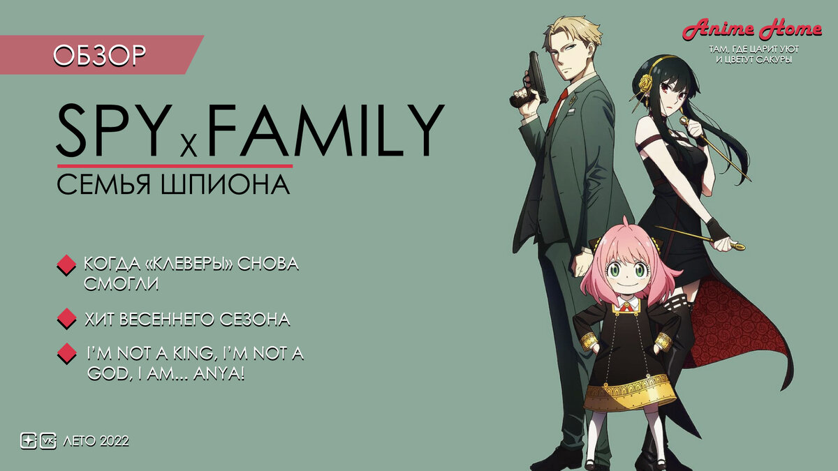 "Семья шпиона" стала сочным ветром на ароматном поле маков. Свежий порыв чего-то, наконец, нового. Аниме далеко не шедевр, но оно стало открытым окном средь массы исекаев. Приятная и расслабляющая комедия о довольно сложных взаимоотношениях ненастоящей семьи как с обществом, так и внутри нее. Но как мы все знаем, в основе любой комедии всегда лежит черным якорем трагедия. На этом все, пишите ваше мнение о произведении. Еще услышимся.