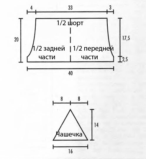 Голубой купальник состоит из лифчика и шорт. Связан купальник спицами, а обвязан по краям крючком. Посмотреть фото в другом размере можно здесь. Размер: 42 (обхват груди - 88, обхват талии - 70, обхват бедер - 94) Вам потребуется: 150 г пряжи Mille Fine Tropical Lane (100% египетский хлопок, 160м/50г) голубого цвета; Спицы №3; Крючок №2,5; 1 пара жестких чашечек Узоры: Лицевая гладь: лиц. р. – лиц. п., изн. р. – изн. п. Используемые сокращения: В. п. – воздушная петля; Соед. ст. – соединительный столбик; СБН – столбик без накида; С1Н – столбик с 1 накидом Плотность вязания, лицевая гладь: 30 п. и 44 п. = 10 х 10 см Описание вязания Лифчик Чашечки: на спицы набрать 50 п. и вязать лицевой гладью. В 14-м р. убавить с обеих сторон по 1 п., затем в каждом 2-м р. 23 раза по 1 п. Закрыть оставшиеся 2 п. Другую чашечку связать также. Шорты Половина шорт: на спицы набрать 120 п. и вязать лицевой гладью. На высоте 2,5 см от начала вязания убавить с левой стороны в каждом 2-м р. 1 раз 3 п., 2