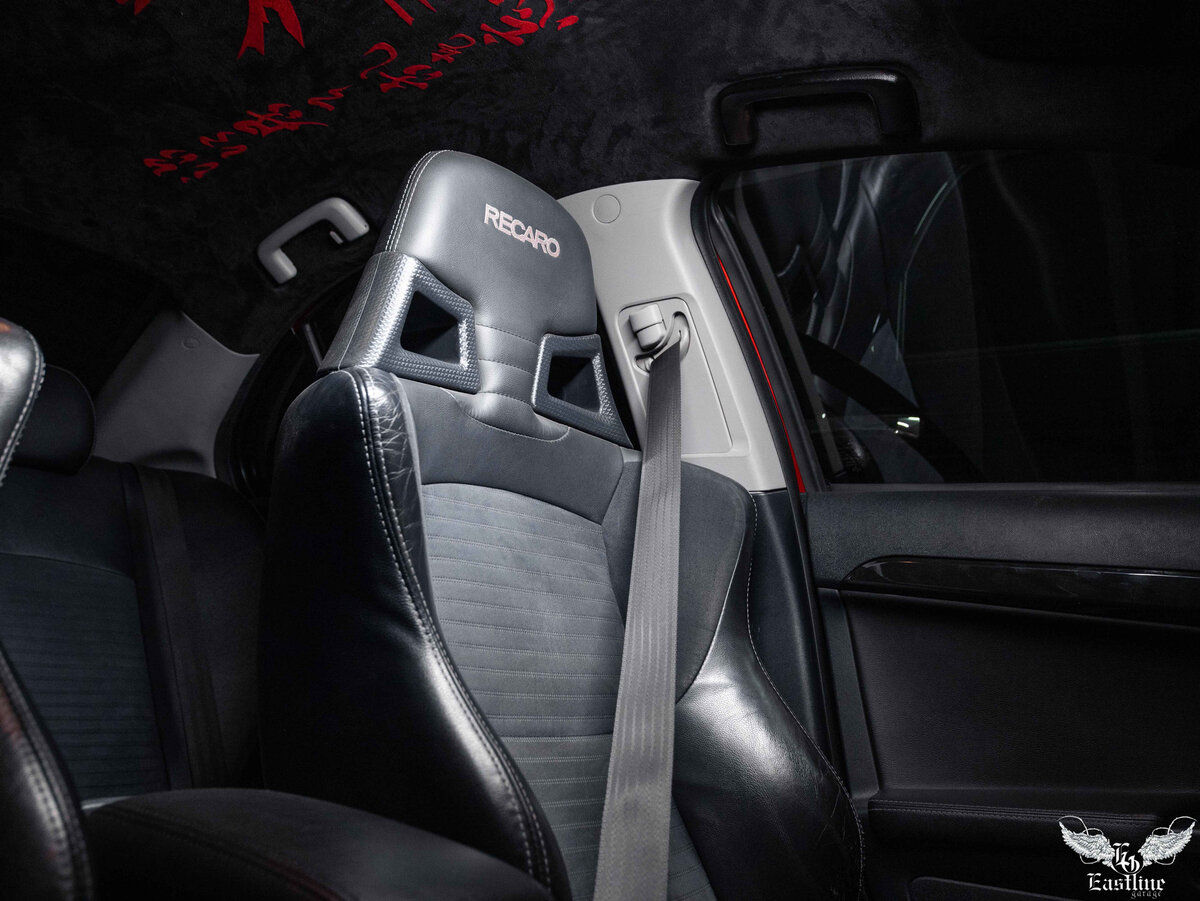 Всем доброго времени суток! Сегодня намочереди у нас довольно редкий японец – Mitsubishi Evolution X. Mitsubishi Evo X (10) – это спортивная вариация более распространенного и известного многим Mitsubishi Lancer. Внешне автомобили похожи, но все же их отличают бампера, расширенные колесные арки, спойлер на крышке багажника; да и вообще, кузов у Evo X более жесткий по сравнению с Lancer. По технической части также есть отличия: у Evo X можно выделить полный привод и мощный турбированный двигатель, это же спортивная, версия. Как уже говорилось, автомобиль довольно редкий, но один такой экземпляр приехал в тюнинг-ателье Eastline Garage на замену ремней безопасности. Замена заводских лент ремней безопасности может производиться по нескольким причинам: некоторые меняют их из-за механических повреждений лент или из-за их плачевного внешнего вида, а другие, как наш владелец, просто хотят добавить в салон автомобиля красок и меняют заводские чёрные или серые ремни на цветные. Замена лент ремн