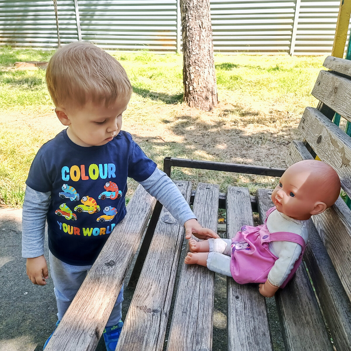 Обычно мы с сыновьями обходим сразу несколько детских площадок. Чтобы чередовать солнечную сторону с тенью. Получать витамин д и не перегреться. Маршруты каждый раз разные, но всегда не менее 2.5 часов на свежем воздухе. А сегодня только выйдя из дома, в метрах 500, нашли на лавке куклу-пупса. И что-то так его жалко стало. Я огляделась. Детей нет. Минут 20 поиграли. Никто не пришёл за ней. Она грязная, не ухоженная. Явно ребёнок с ней не спал каждую ночь, в обнимку. Я завернула её в кофту сына. Не знаю зачем, чтобы обогреть вниманием. И всё последующие 2 часа носила с собой. У меня даже возникло желание нашить ей много вещей вручную. И каждый месяц переодевать в новое. Найду уроки по кройке и шитью платьев, шортиков, блузочек. А также полимерной глине и сделаю ей наряды, обувь и сумочки. А потом заведу маленький чемоданчик с её вещичками. Я люблю мастерить своими руками. Раньше вышивала крестом и бисером. Сейчас всё купленные вещи подшивают руками. Долго, зато успокаивает. Р